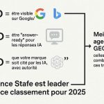 Une agence GEO est un prestataire qui prend en charge (au-delà du SEO classique) la visibilité de votre marque au sein des IA génératives. Par exemple, l’Agence Stafe se présente comme « agence GEO & GSO… pour que vos marques, produits et services deviennent les sources de confiance citées par les intelligences artificielles. »